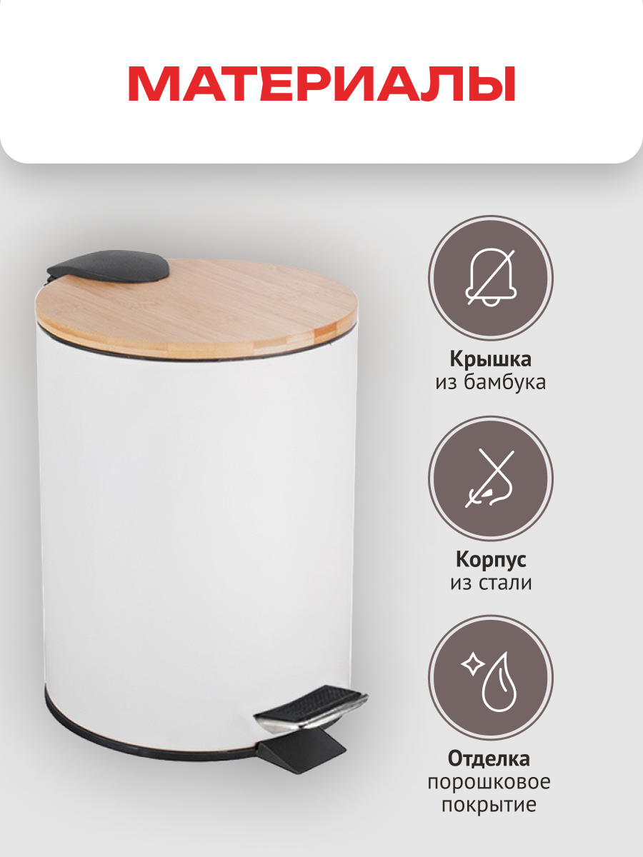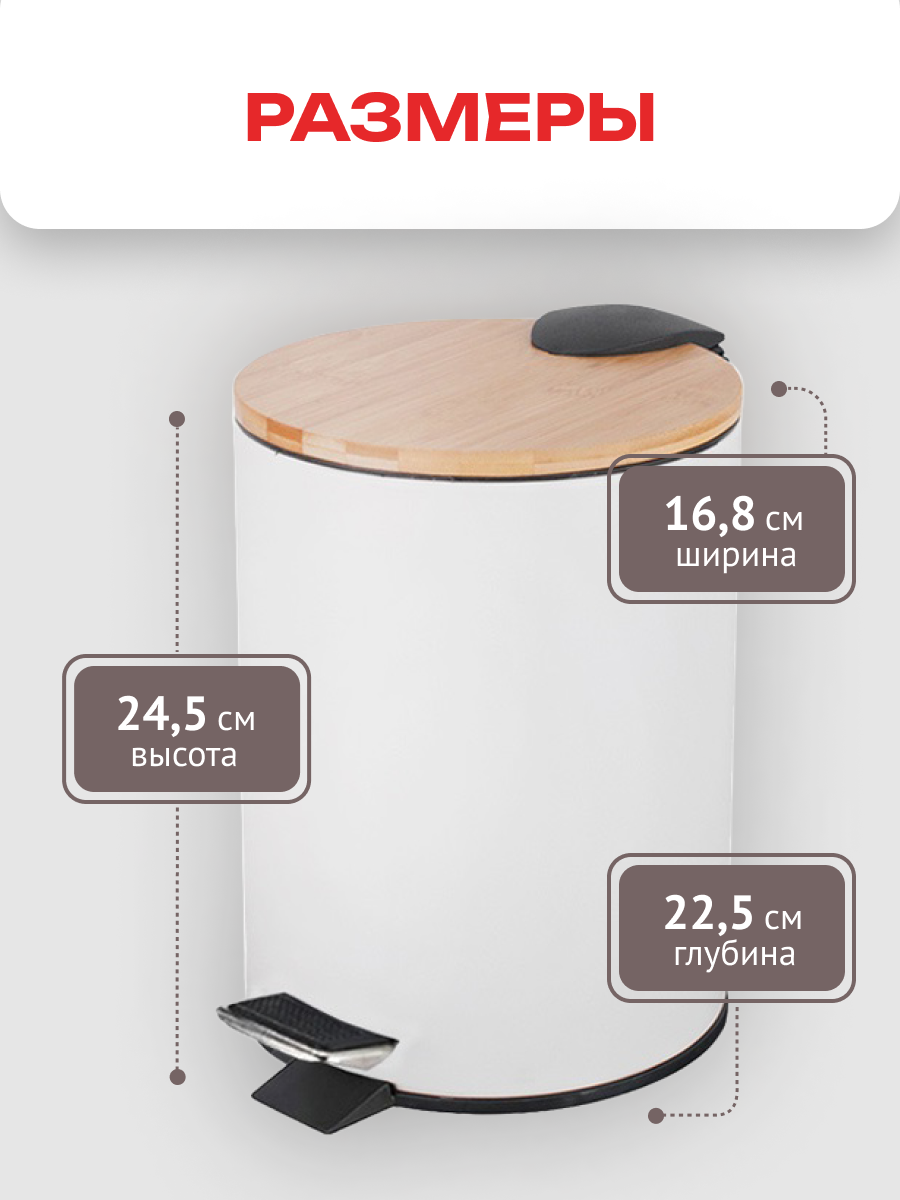 Мусорный контейнер Bambo с педальным механизмом и внутренним пластиковым ведром - отличный вариант для поддержания чистоты и гигиены на кухне или в ванной комнате. Плотное прилегание крышки предотвращает распространение запахов. Корпус мусорного ведра изготовлен из стали толщиной 0,26 мм. Отделка корпуса: матово-белое порошковое покрытие. Крышка изготовлена из бамбука, без функции мягкого закрывания. Внутреннее съемное ведро изготовлено из полипропилена. Внутренне ведро черное с металлической ручкой. Высота контейнера с поднятой крышкой 41,5см. Размер контейнера Ø16,8х23,5 см. Габаритные размеры: высота 24,5, ширина 16,8см, глубина 22,5см. Объем- 3 л.